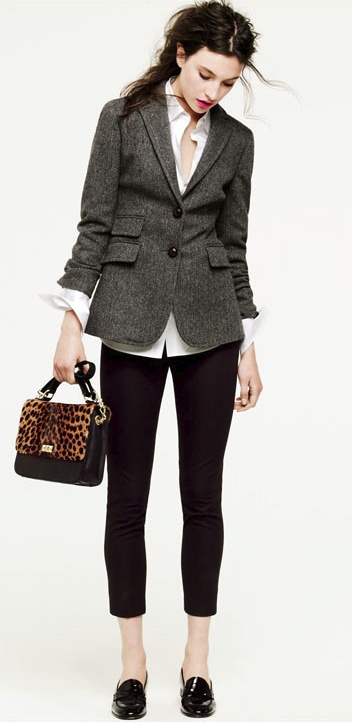 No tienes porque lucir tan seria con un saco de paño gris. Fíjate cómo en la foto, la modelo tiene una blusa con las mangas y la parte inferior salidas.
