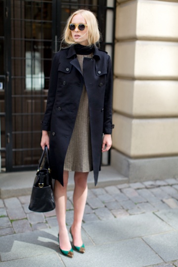 Este abrigo es de una textura ligera, ideal para cuando el clima esta en transición. Con jeans luce genial, pero también para el trabajo queda perfecto. Aquí, los zapatos turquesa con punta dorada, son la «cereza del pastel». Trata de combinarlo con otros colores que no sean el típico negro o gris.