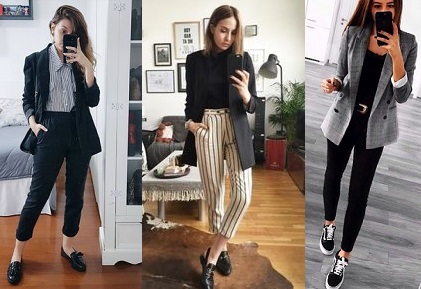 El mejor calzado para usar estos tiempos son los chatos: Flats en punta para algo más elegante. Oxfords, ballerinas o zapatillas para algo más casual. Porque zapatillas pues ahora tenemos que caminar más, no podemos llevar auto particular, y tomar bus es un poco peligroso, así que el taxi es otra opción para distancias largas. Con distancias cortas es preferible caminar o incluso usar bicicleta.