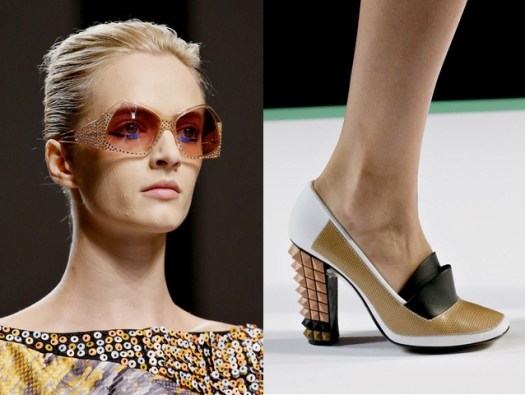 Los zapatos (cerrados en su mayoría) también destacaron por su imponente presencia y detalles geométricos al igual que los accesorios: pulseras y anillos que combinaban a la perfección con el concepto que FENDI instaló en la pasarela. Vimos ciertos toques metalizados, tendencia que pega fuerte en la actual propuesta europea.